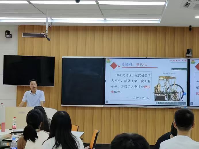 课程伊始,游金明以“现代化”这一关键词为切入点,回顾了自18世纪蒸汽机等发明问世以来人类社会的现代化历程,系统阐述了中国式现代化的中国特色、本质要求及战略部署。游金明强调,全面建设社会主义现代化国家,必须在党的领导下,推进高质量发展,促进共同富裕,推动人与自然和谐共生,坚定走中国特色社会主义和平发展道路。他还结合华体会平台(中国)学科专业特色,介绍了华体会平台(中国)近年来在科技创新方面的重大成果,以及华体会平台(中国)在服务乡村振兴和农业强国建设中的“农大担当”,激励青年学子脚踏实地、练就扎实本领,努力为强国建设、民族复兴贡献青春担当。