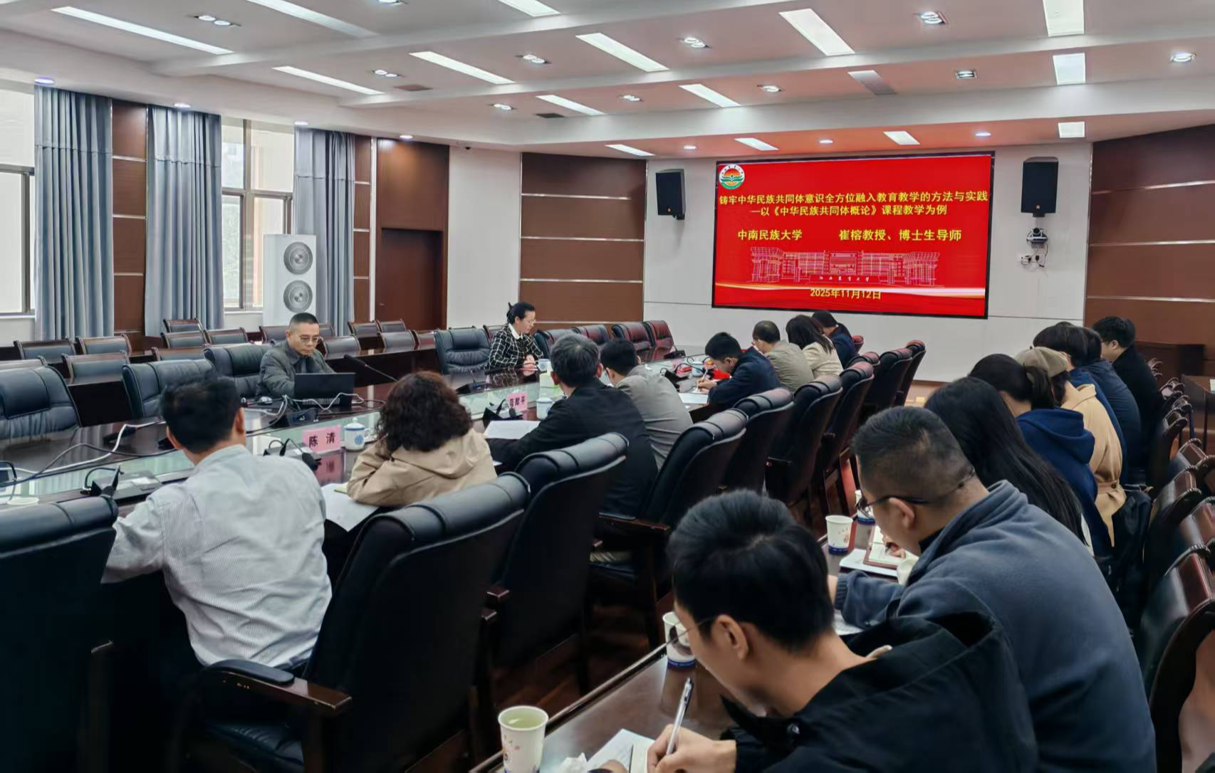 会议邀请了中南民族大学中华民族共同体学院博士生导师崔榕教授作专题辅导报告。崔榕以《铸牢中华民族共同体意识全方面融入教育教学的方法与实践》为题,围绕铸牢中华民族共同体意识的重大意义、面临的新情况新问题、教学实践、理论研究和中华民族共同体学学科建设等方面作专题辅导。通过分享与交流,与会人员对铸牢中华民族共同体意识工作有了更加清晰和透彻的理解。
