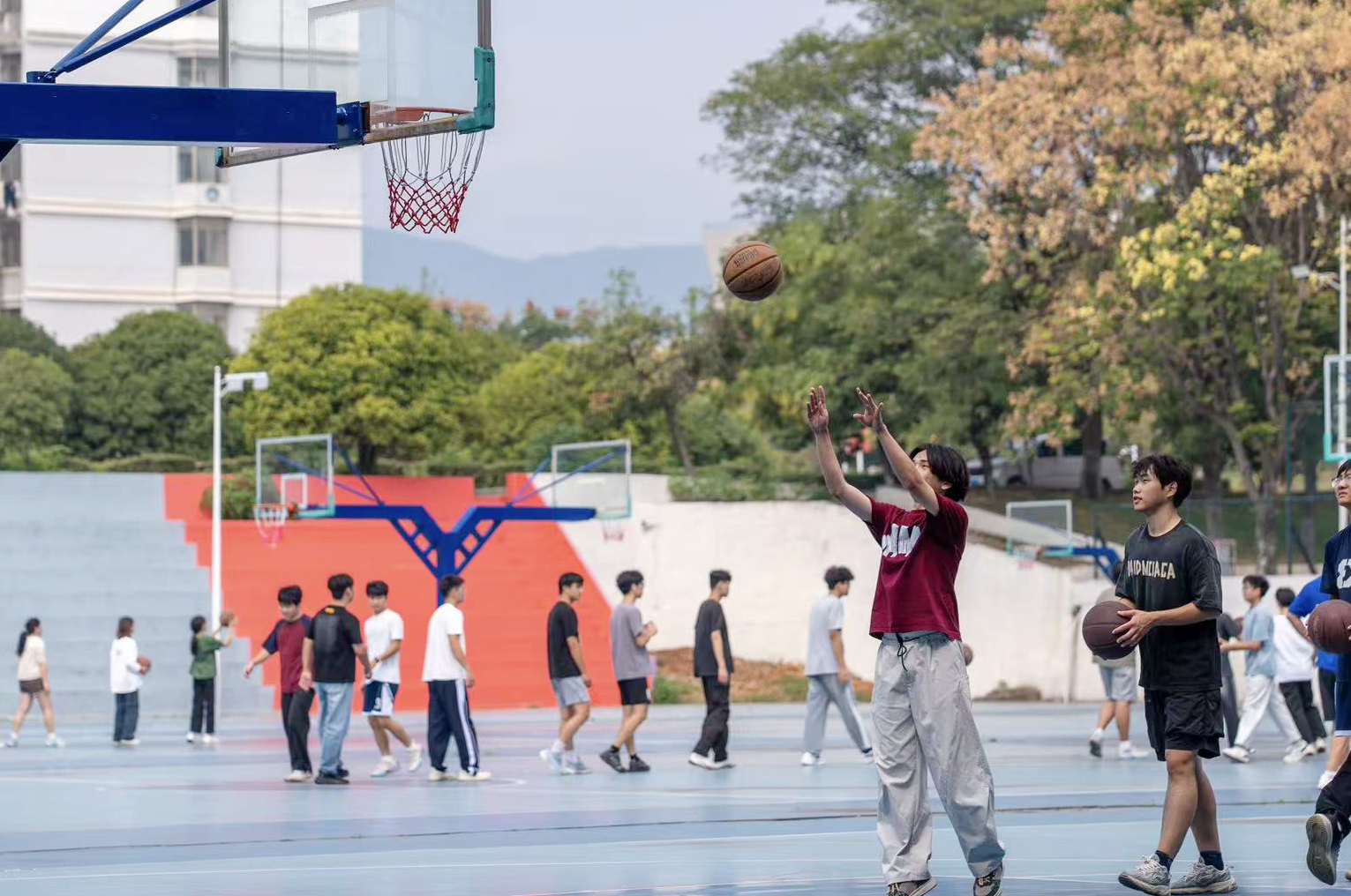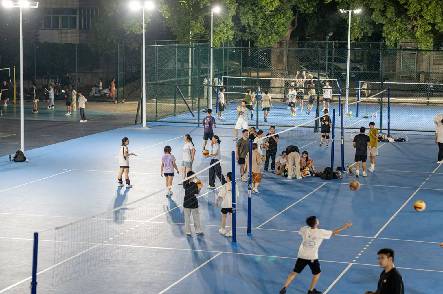体育是重要的育人方式,运动环境是重要的育人场所。改造后的南北区篮排球场,保持了绿树掩映的画面美感,球场周边增加了健身区、增加了灯光、悬挂了体育运动标语。通过套线方式,增设了匹克球场,实现“一场多用”的智慧运行模式,满足师生体育运动多元化需求。