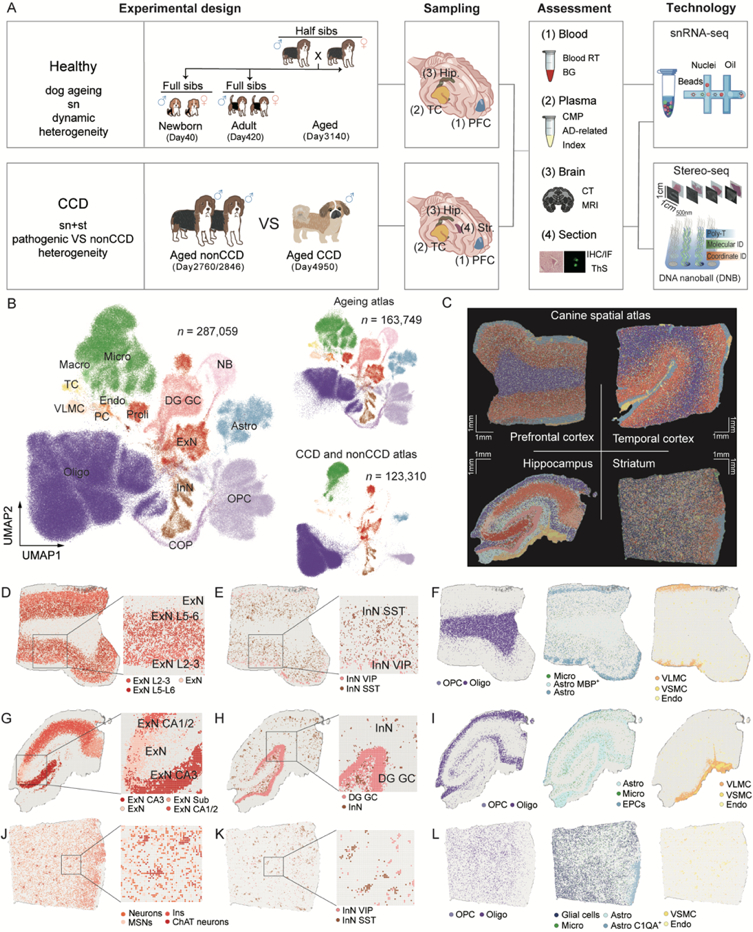 研究团队首先利用单核RNA测序(snRNA-seq)和空间转录组(Stereo-seq)技术,构建了健康衰老大脑的单核转录组图谱,以及CCD与非CCD犬大脑的对比性单核与空间转录组图谱。基于上述图谱,分别开展了以下分析:(1)正常衰老过程中不同细胞类型的转录动态变化;(2)CCD与非CCD犬大脑的病理机制差异分析;(3)正常衰老与CCD相关病理性衰老的分子特征比较,特别关注小胶质细胞在这两种状态下的共同与特异性变化。