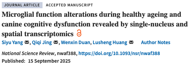 近日,华体会平台猪遗传改良与种质创新全国重点实验室黄路生院士团队在国际知名学术期刊《National Science Review》(五年影响因子17.7)发表了题为“Microglial function alterations during healthy ageing and canine cognitive dysfunction revealed by single-nucleus and spatial transcriptomics”的重要研究成果。该成果系统研究了健康衰老与老年痴呆认知障碍犬的脑细胞转录组,揭示了认知障碍犬中小胶质细胞C1QA与神经元CRT互作介导突触损伤的新机制。