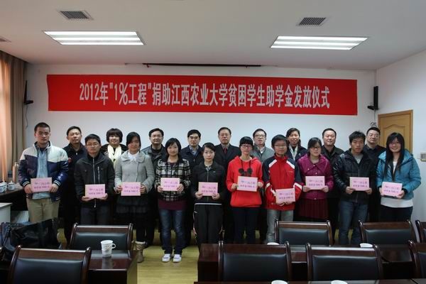 成立大会后,还举行了由共青团江西省委、民进江西省委员会、江西省青少年发展基金会共同发起的以“捐献1%,爱心100%”为主题的“1%工程”爱心助学活动仪式,参加大会的领导和嘉宾为江西农大受到捐助的10名学生颁发了助学金并与同学们合影留念。(统战部)