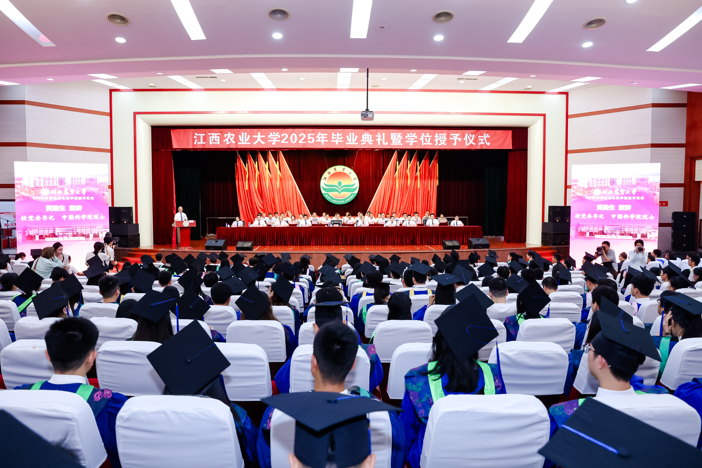 毕业典礼在庄严的国歌声中拉开帷幕。校党委书记黄路生院士致辞,向全体毕业生表示热烈的祝贺,向悉心指导、无私支持毕业生的老师、亲友,致以衷心的感谢和崇高的敬意。黄路生回顾近些年,华体会平台(中国)坚持以学生为中心,扎实推进华体会平台(中国)建设发展,全面建设宜学宜教宜研的美丽江农校园,取得了一系列办学成果,母校因为有了你们,变得更加美好、更有潜力。历经120周年的江农,一路艰辛、一路辉煌,母校郑重与每一位毕业生相约:与时代同频,与祖国同行。