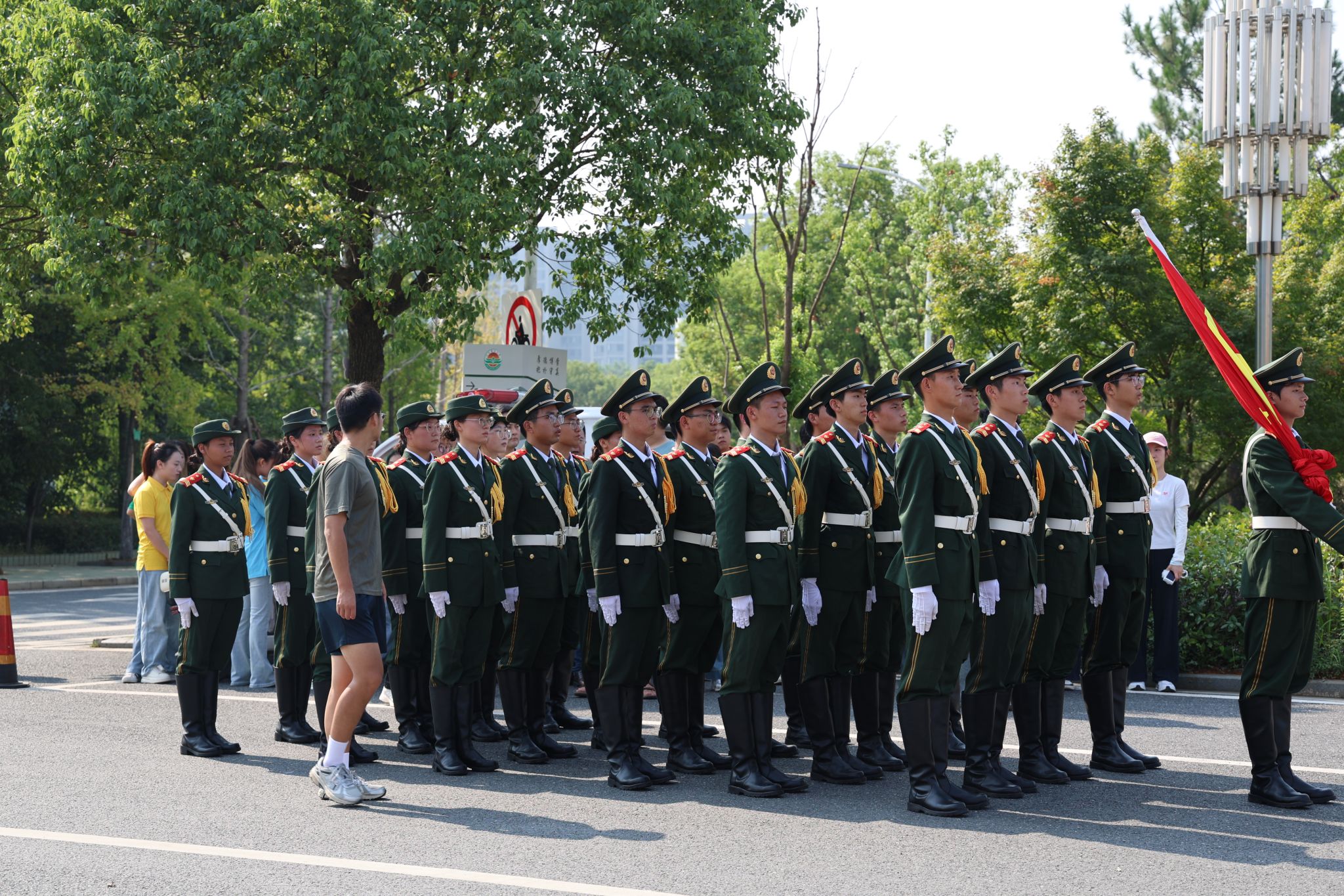国旗巡游展英姿,青春步伐显担当。英姿飒爽的国旗仪仗队队员们迈着铿锵有力的步伐,护卫五星红旗行进在校园主干道。他们挺拔的身姿、整齐的动作,展现了江农学子昂扬的精神风貌,吸引了众多新生家长驻足拍照,成为校园里一道亮丽的风景线。