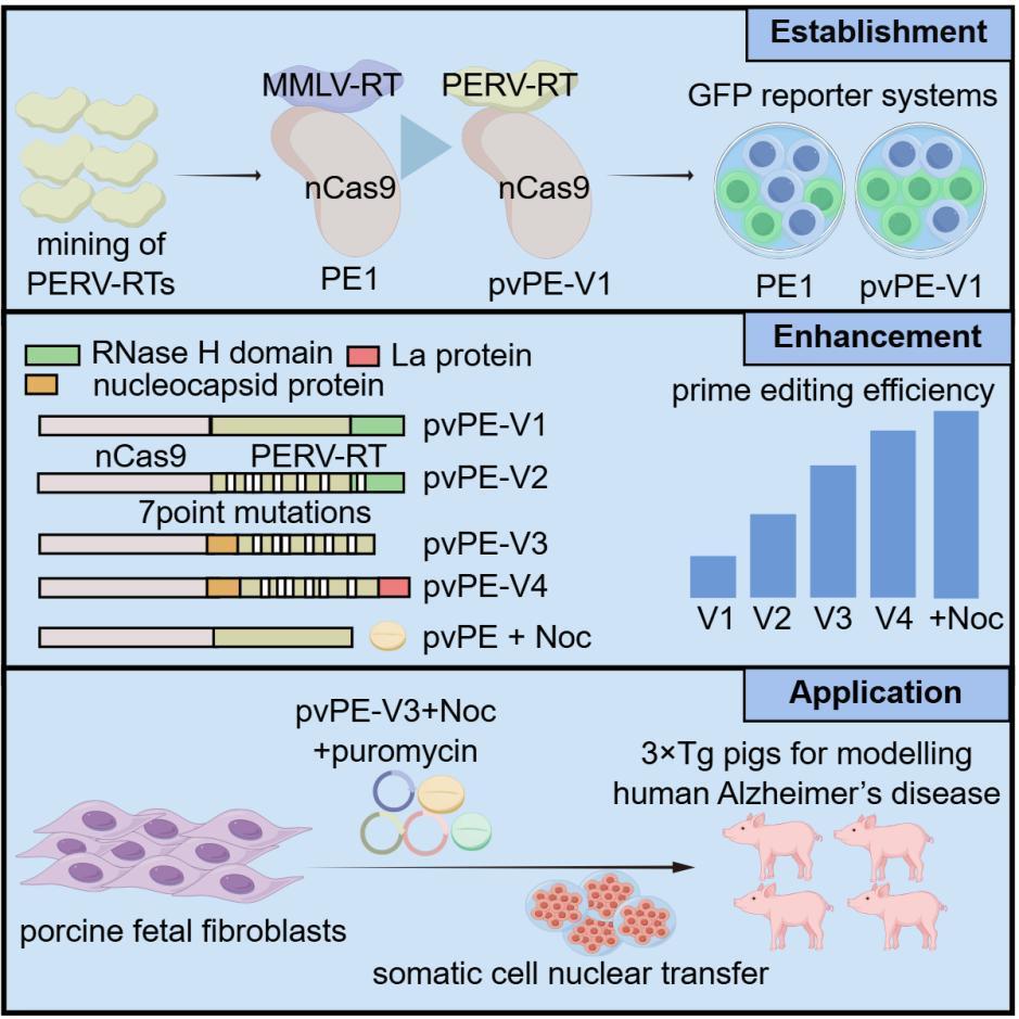 先导编辑是近年来由基因编辑领域国际知名科学家David Liu团队率先开发、并获得迅速发展的新型基因组编辑技术,可以在不引起DNA双链断裂的情况下实现精准地插入、替换和缺失等多种编辑类型,被誉为“万能型”基因编辑工具。然而,该技术目前仅在HEK293T等少数细胞系中展示出较高的效率,在猪等大型农业动物中的编辑效率比较低下,成为限制其广泛应用的重要因素。研究团队通过对全球不同猪种PERV-RT序列进行系统研究,筛选出86个变体,并利用荧光报告系统评估其活性,发现一条来自中国巴马香猪的C型PERV-RT活性最强;由此构建的pvPE-V1编辑器,较David Liu第一代编辑器PE1的平均效率提升1.28倍。随后,通过系统性筛选有益氨基酸突变位点、对PERV-RT重要功能元件进行结构优化以及融合有益功能模块等手段,将pvPE-V1逐步升级为pvPE-V2、pvPE-V3和pvPE-V4。此外,该研究还首次发现小分子药物诺考达唑可显著提升PE效率,并通过转录组测序,揭示其可能通过调控细胞周期抑制错配修复途径发挥作用。